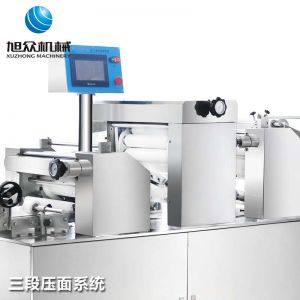 旭眾牌XZ-15C三道搟面酥餅機是我公司仿手工制作面食產品的機型,占地面積小,重量輕,它吸收國內傳統手工制作技術,即運用搟面杖壓面和打擊面團,以保證高面筋性和面帶的密度,并綜合考慮面食的口感而研發。