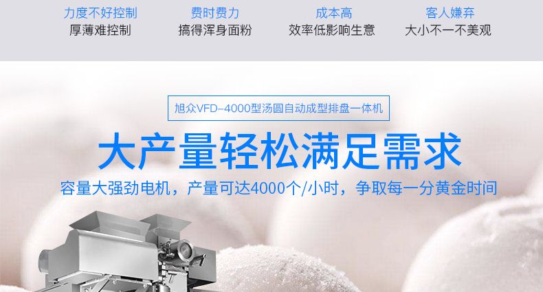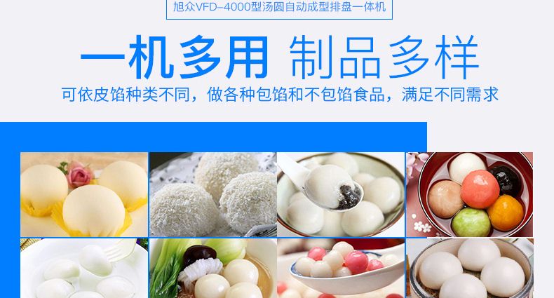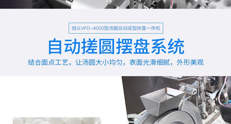 旭眾牌VFD-4000型湯圓自動成型排盤一體機(jī)是一款功能齊全、適用性廣的機(jī)器,可依外皮及餡料的各類不同,制作湯圓、豆沙包、南瓜餅、奶黃包、含餡饅頭、玉兔包等包餡食品。