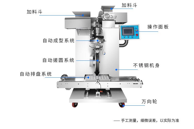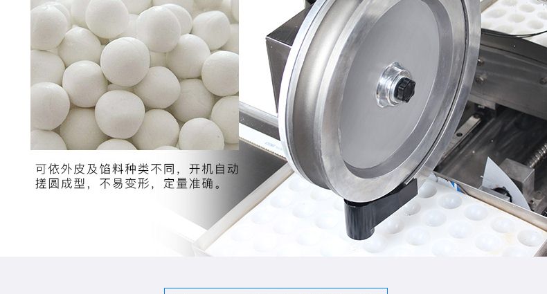◆自動化程度高,只要將面團(tuán)與餡料放入進(jìn)料口,開機(jī)便可自動搓圓成型,制品不易變形,定量準(zhǔn)確;