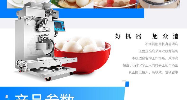 本機(jī)工作效率高,相當(dāng)于8-12個工人同時手工制作湯圓,真正的低投入、高收效、省錢省工。本機(jī)對面粉質(zhì)量要求不高,適合各種工作場所。本機(jī)提供免費(fèi)上門培訓(xùn)指導(dǎo)、安裝、調(diào)試、面點(diǎn)工藝傳授。